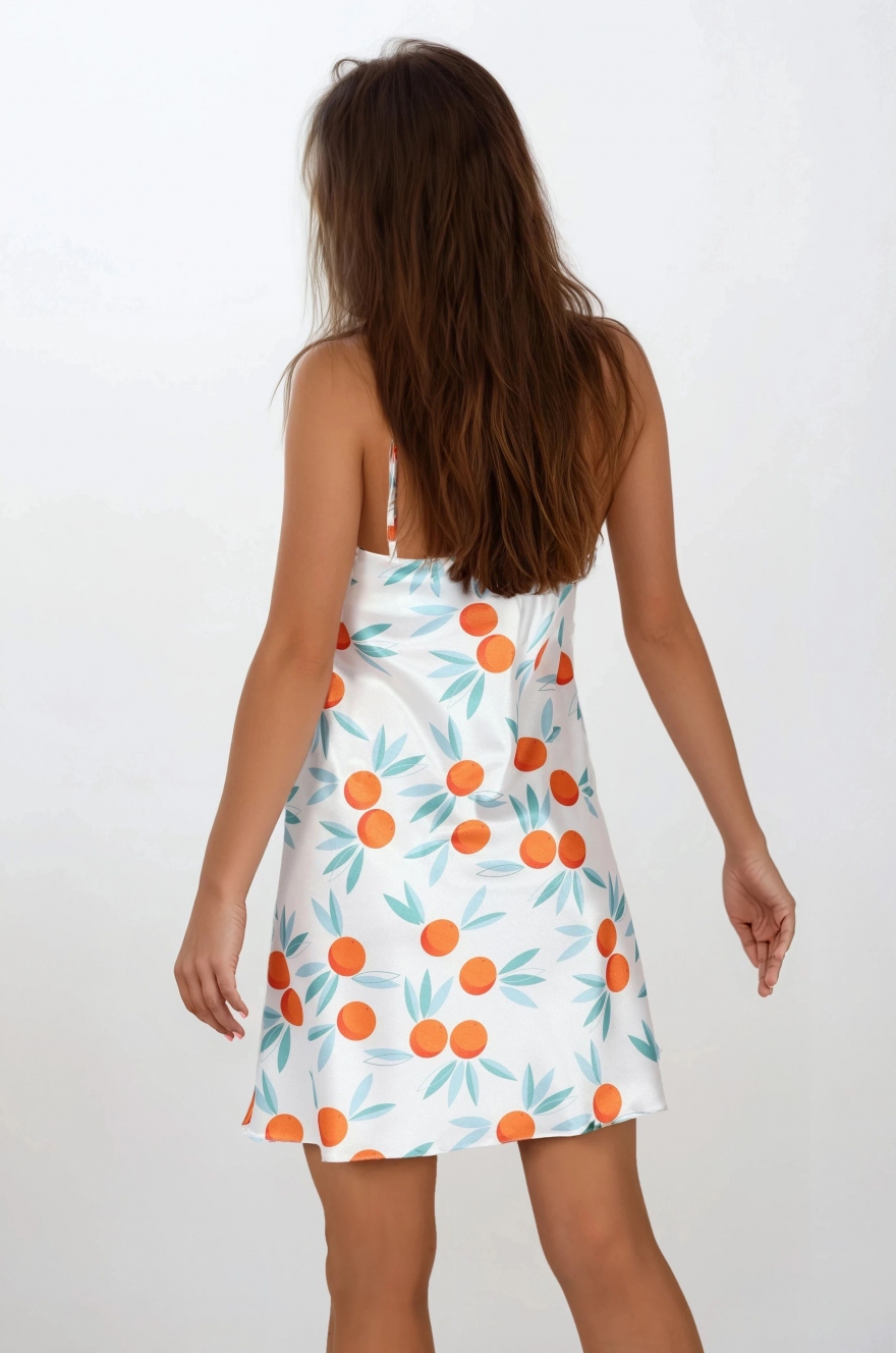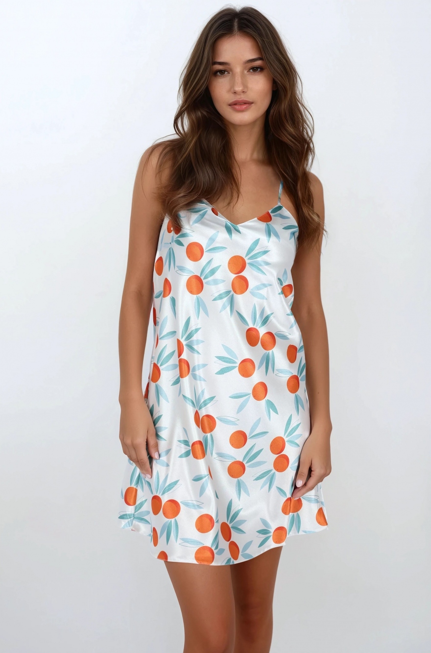 Śliczna, klasyczna koszulka noca wykonana z wzorzystej satyny. Na cieniutkich ramiączkach o regulowanej długości, dzięki którym góra koszulki prezentuje się lekko i pozwala wyeksponować ramiona. Dekolt do literki V. Krój luźny, zwiewny, kobiecy, wysoce komfortowy.